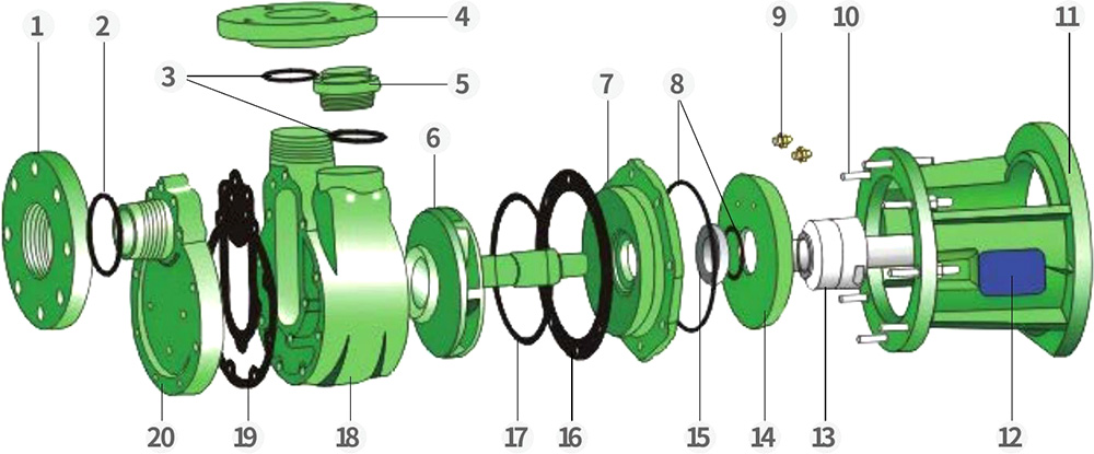 Naše továrna se specializuje na výrobu celoplastových korozivzdorných odstředivých a samonasávacích čerpadel ze dvou materiálů — PVDF a FRPP — ve čtyřech řadách (FV, FP, FVZ, FPZ). Čerpadla PVDF jsou vhodná pro manipulaci se silnými kyselinami, silnými oxidanty, halogeny, aromatickými uhlovodíky, alifatickými sloučeninami a chlorovanými rozpouštědly s rozsahem provozních teplot -40 °C až 140 °C. Čerpadla FRPP jsou ideální pro silné alkálie i obecné kyseliny, zásady, soli a jejich deriváty s rozsahem provozních teplot -40 °C až 90 °C. Čerpadla jsou obvykle poháněna energeticky účinnými motory typu Y. Na vyžádání lze dodat motory s ochranou proti výbuchu.